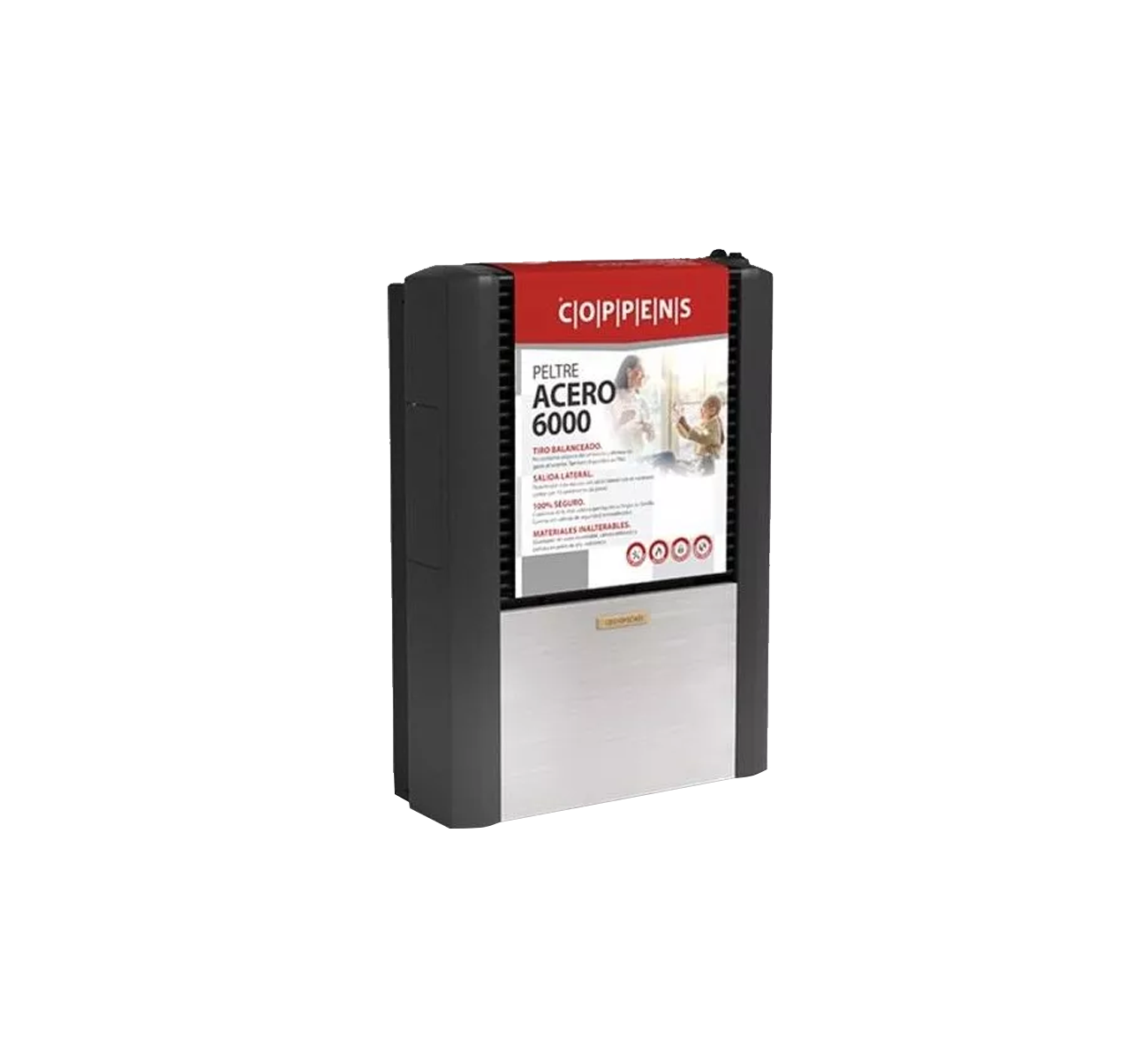 Peltre Acero 6000 Para ambientes grandes. Multiples opciones de tiraje. Unico con tiraje lateral opcional. Mayor ahorro debido a su exclusivo sistema de camara de acero con enlozado vitroceramico. 100% Seguro, con valvula de seguridad . Mayor duracion. Materiales inalterables. Facil instalacion. Multigas y tiro balanceado. Ancho: 56 cm Alto: 80 cm Profundidad: 21 cm Potencia: 6000 kcal-h Espacio a calefaccionar: 45 m2 Encendido Piezoelectrico Quemador Acero inoxidable