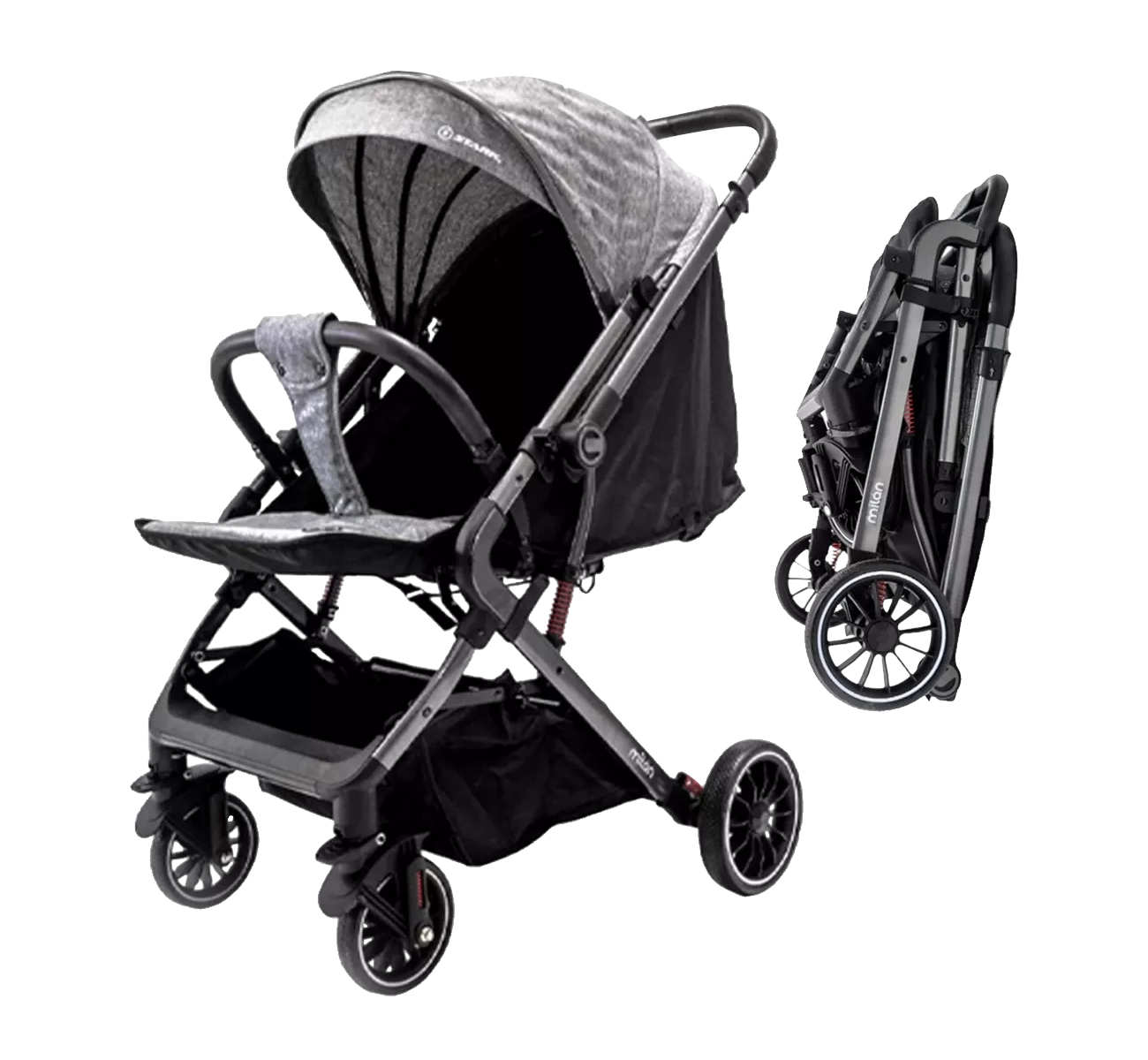 VIAJES SEGUROS Y CÓMODOS Manija desplegable – Pliegue rápido – Tapizado extraíble – Fácil transporte – Capota móvil y reclinable – Sistema de seguridad cinturón quintuple – Cinturón de seguridad – Ruedas con amortiguación – Canasto porta objetos – Incluye red de protección contra insectos Chasis de Aluminio, ultra liviano Rueda Delantera 14cm Rueda Trasera 19cm