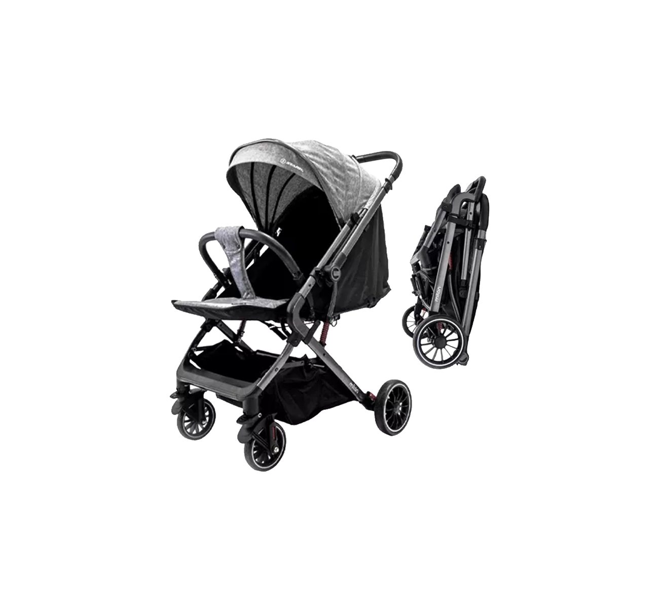 VIAJES SEGUROS Y CÓMODOS Tolera hasta 18kg Manija desplegable Pliegue rápido Tapizado extraíble Fácil transporte Capota móvil y reclinable Sistema de seguridad cinturón quíntuple Cinturón de seguridad Ruedas con amortiguación Canasto porta objetos Incluye red de protección contra insectos Chasis de Aluminio, ultra liviano Rueda Delantera 14cm Rueda Trasera 19cm