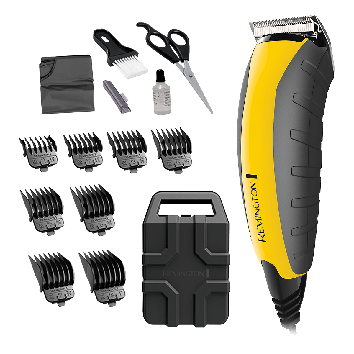 • Uso con Cable • CUCHILLAS DE ACERO INOXIDABLE • CUCHILLAS AUTOAFILABLES • Incluye 15 piezas: 8 Peines de guía, Cuchillas removibles Precision Ground, Cepillo para el cuello, Aceite lubricante, Tijeras, Capa y estuche duro de almacenamiento • Protector de Hojilla • 2 veces más potente para cortes rápidos y limpios • Amarillo https:–www.remingtonlatam.com-ar-producto-hombre-cuidado-masculino-cortadoras-de-cabello-cortadora-de-cabello-remington-virtualmente-indestructible-