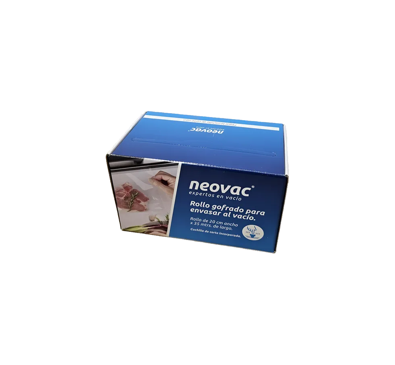 DISPENSER DE ROLLO GOFRADO – RG203500 20CM (20x3500cm) Cuchilla incorporada Compatible con todas las envasadoras hogarenas Medidas del rollo: 20x35cm Medidas de la caja: 250x150x150mm Espesor: 75 micrones