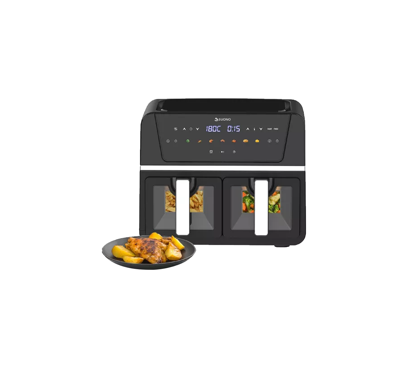 Freidora De Aire Suono Air Fryer Digital 9 Litros 1700W Potencia: 1700W Panel digital a color con control tactil. Compartimiento doble de 4.5L cada uno. 7 programas de coccion Temporizador 0 a 60 minutos Temperatura 80º a 200º centigrados para cada compartimiento Material interior antiadherente