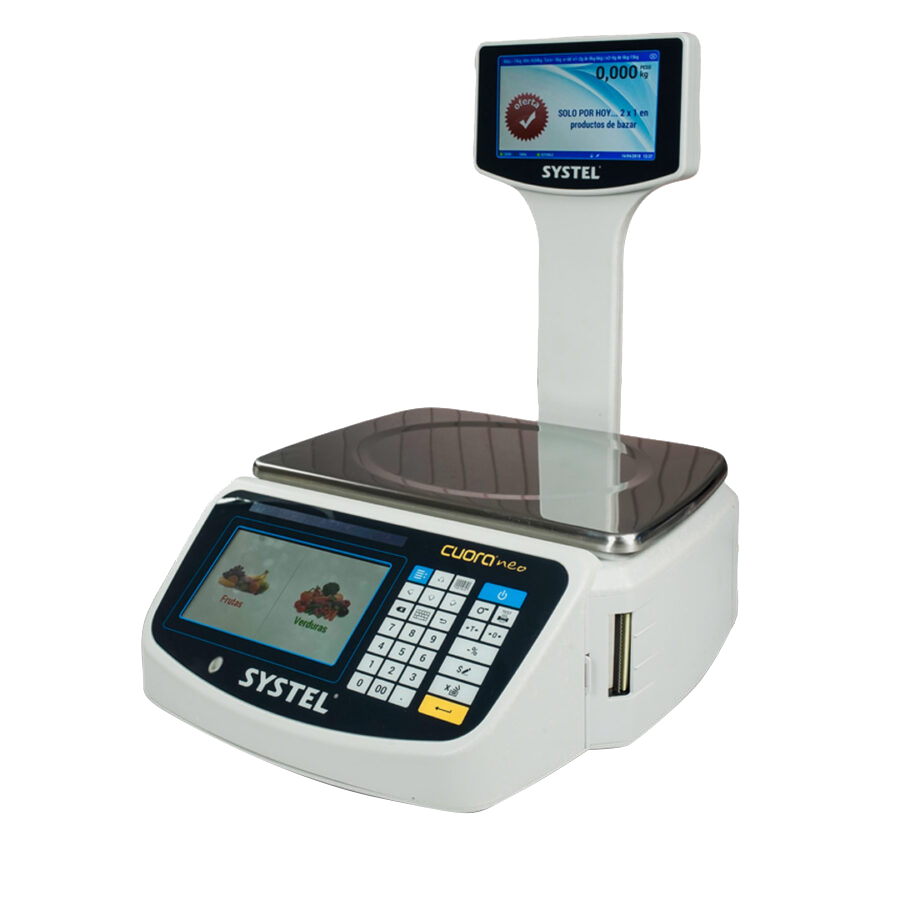 CUORA NEO BALANZA PC DE DISEÑO MODERNO Y ATRACTIVO – SOFTWARE DE AVANZADA – PANTALLA TOUCH DE 7” PARA OPERADOR Y VISOR LCD TFT 7” PARA CLIENTE – 100.000 PLUs – FUNCIONES: VENTA ASISTIDA Y AUTOSERVICIO, VENDEDOR FLOTANTE – CONECTIVIDAD ETHERNET + WIFI – EDITOR DE ETIQUETAS – GESTION DE VENTAS -EXPORTACION DE REPORTES Y ESTADÍSTICAS – INCLUYE BANDEJA DE MELAMINA DE GRAN CAPACIDAD. 15 KG EQUIPO DOBLE RANGO RESOLUCION 2 g DE 0 – 6 kg – 5 g DE 6 – 15 kg CAPACIDAD MÍNIMA 40 g