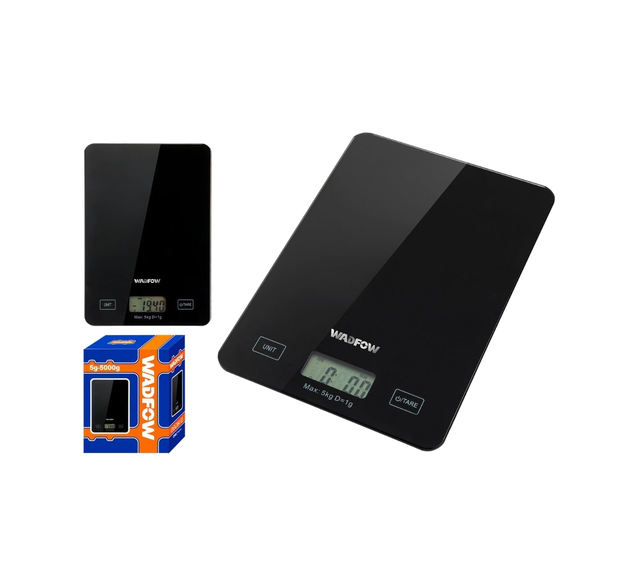 Balanza electronica negra – WDFWKE3504 Capacidad: 5g-5000g Unidad: g-kg-lb-oz-ml-milk Tamano: 21.5*15*1.8cm Fuente de alimentacion: 1*CR2032 Material: Vidrio templado, PS Con apagado automatico Muestra valor numerico: 1g Uso del display: LCD muestra Con botones ON-OFF, UNIT, TARE
