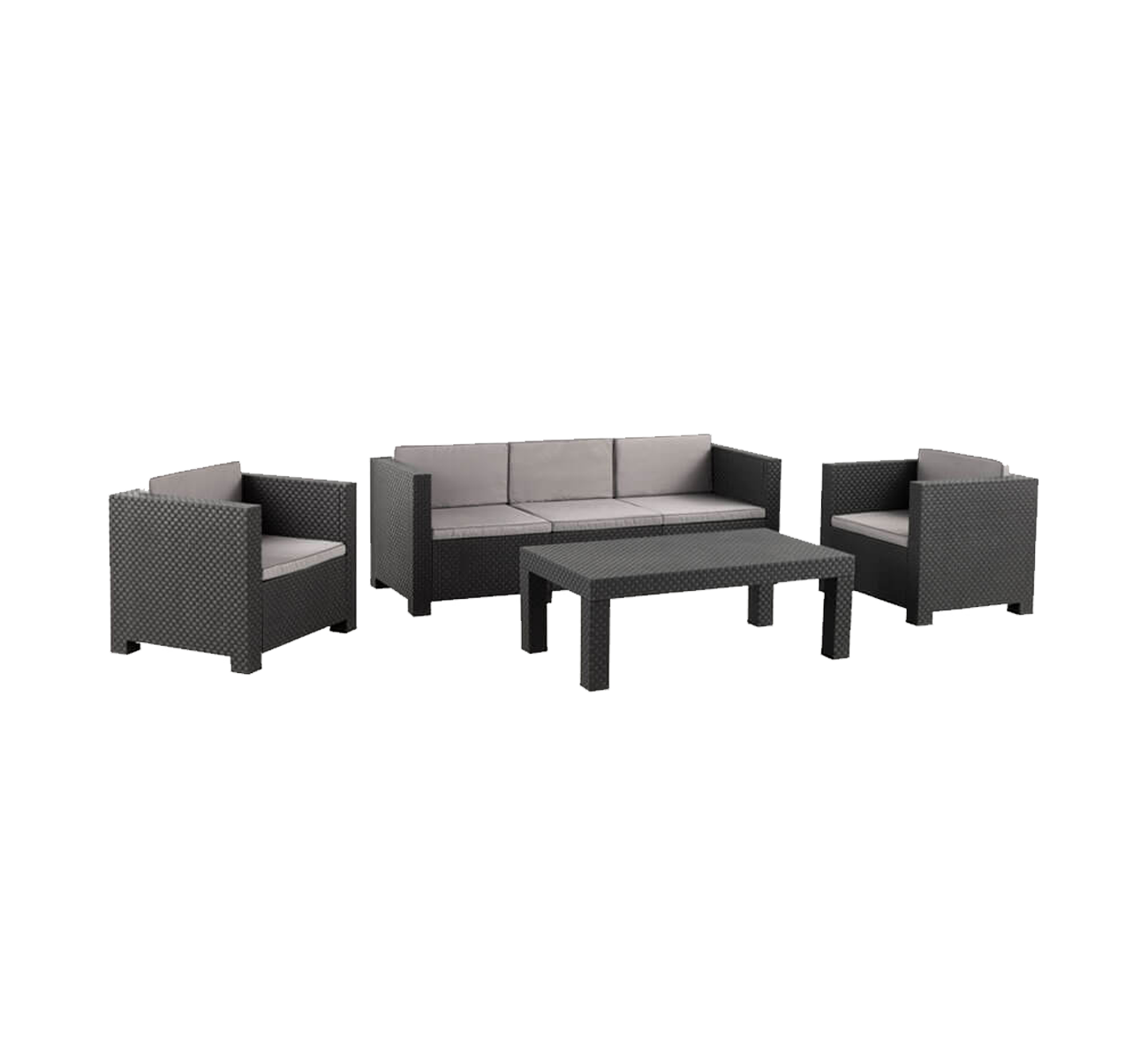 Set Diva: Tropea – BER55467 1 sofa de 3 plazas: 190×66×72 cm. 2 sillones individuales con cojines de asiento 74×66×72 cm. 1 mesa larga de centro 118×63×43 cm Resistente a las inclemencias del tiempo y rayos UV. Facil de limpiar con agua y jabon. Montaje rapido y sencillo. Fabricado en Espana con plastico reciclado.